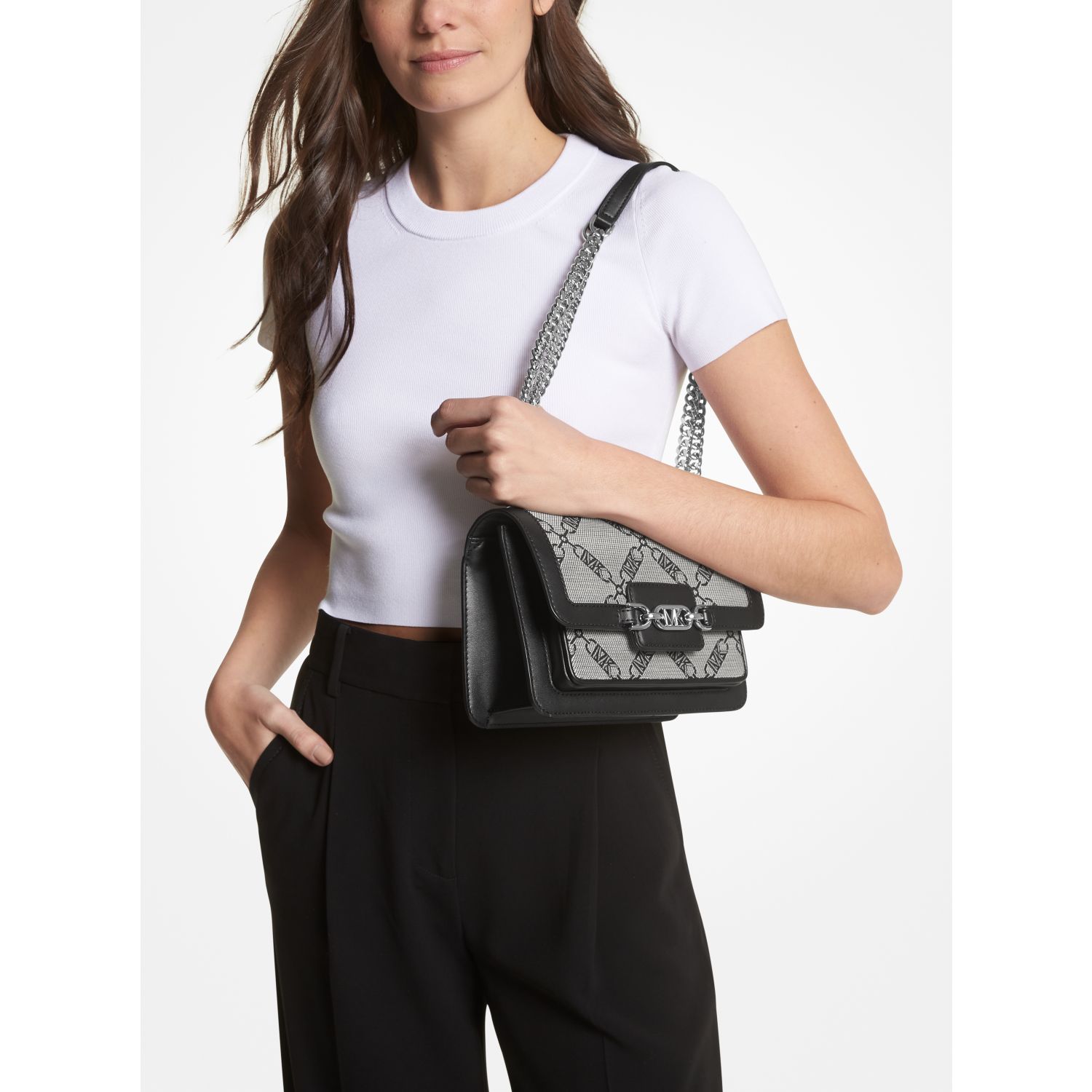 With its luxe hardware, smooth trim and woven logo pattern, our Heather bag puts a fashion-forward spin on the classic shoulder style. The foldover flap features our iconic Empire hardware and opens to a lined interior with pockets to keep your essentials organized. Reach for it to enliven the season’s polished dresses.