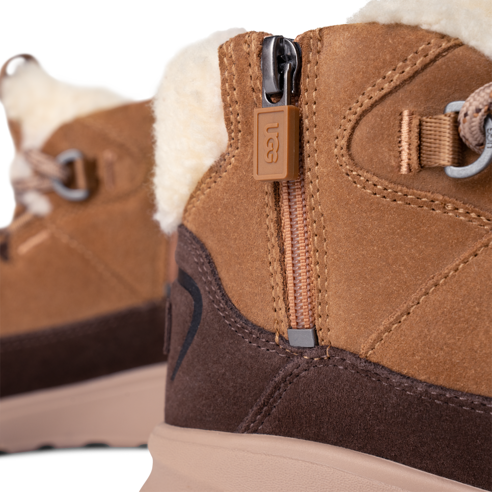 - Medial zipper, Metal lace D-rings, Non-wicking laces made with 100% recycled polyester fibers